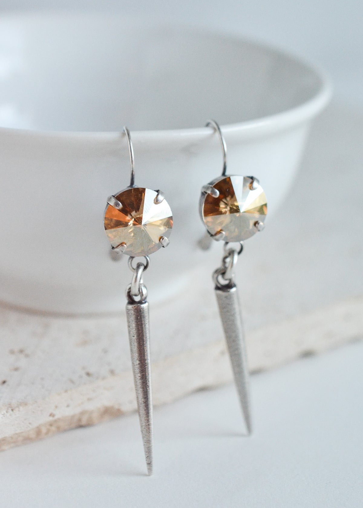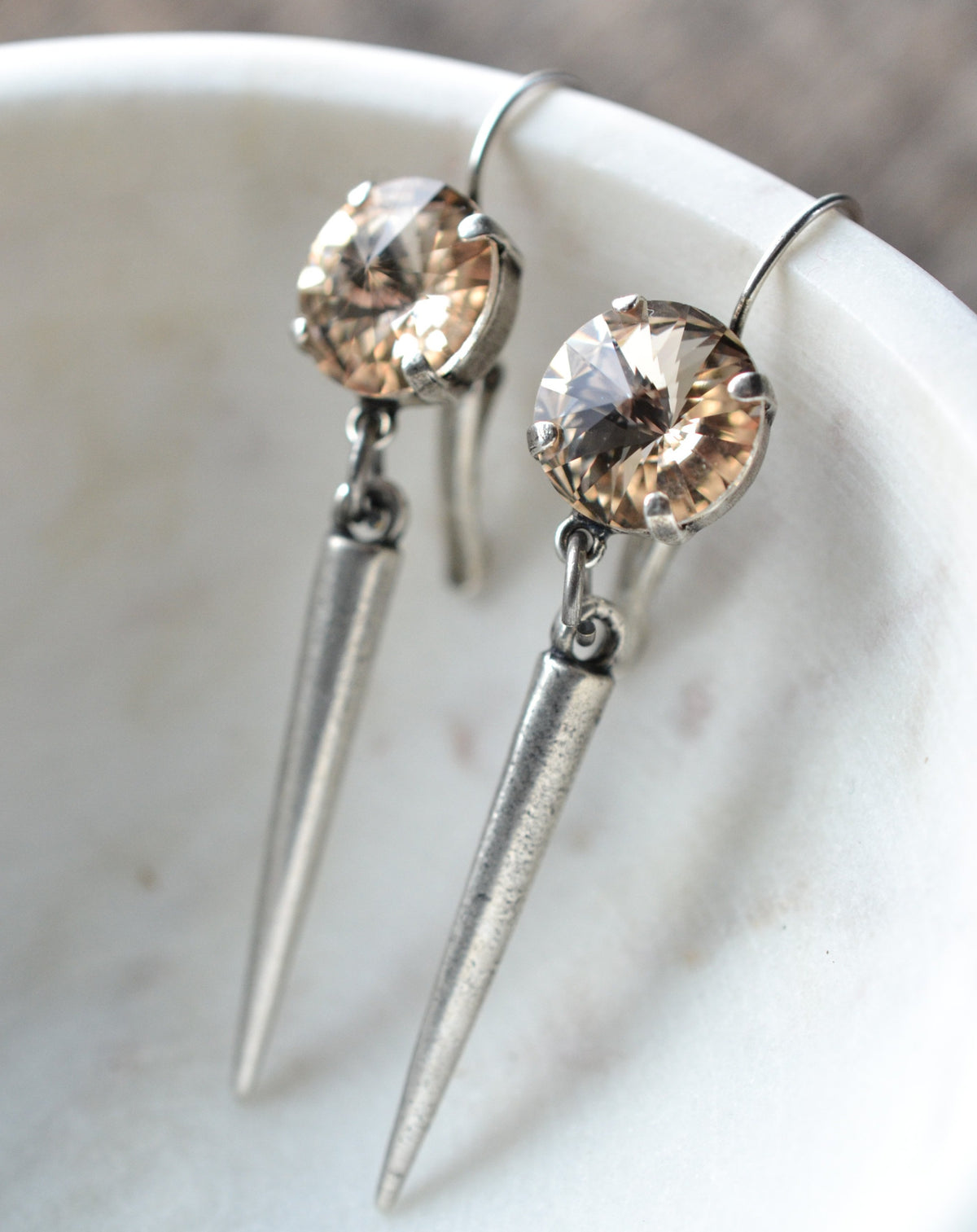 Edgy Glam. Gabby features a Swarovski Rivoli stone and a metal spike drop. The total length of this earring is just over 2".