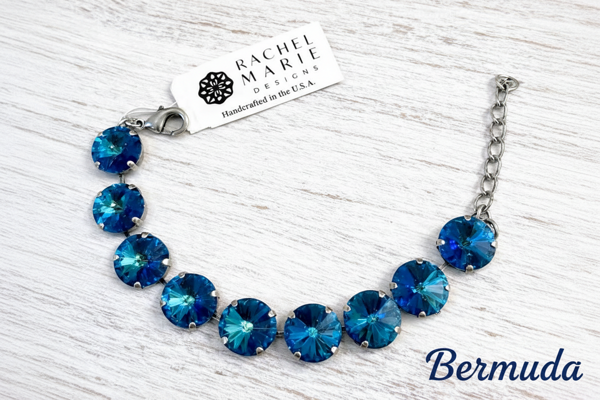 Jaden was one of the first bracelets that we offered in our lineup. 12mm Rivoli stones lined up for a total length of 7" with an extender. Stack or wear solo.