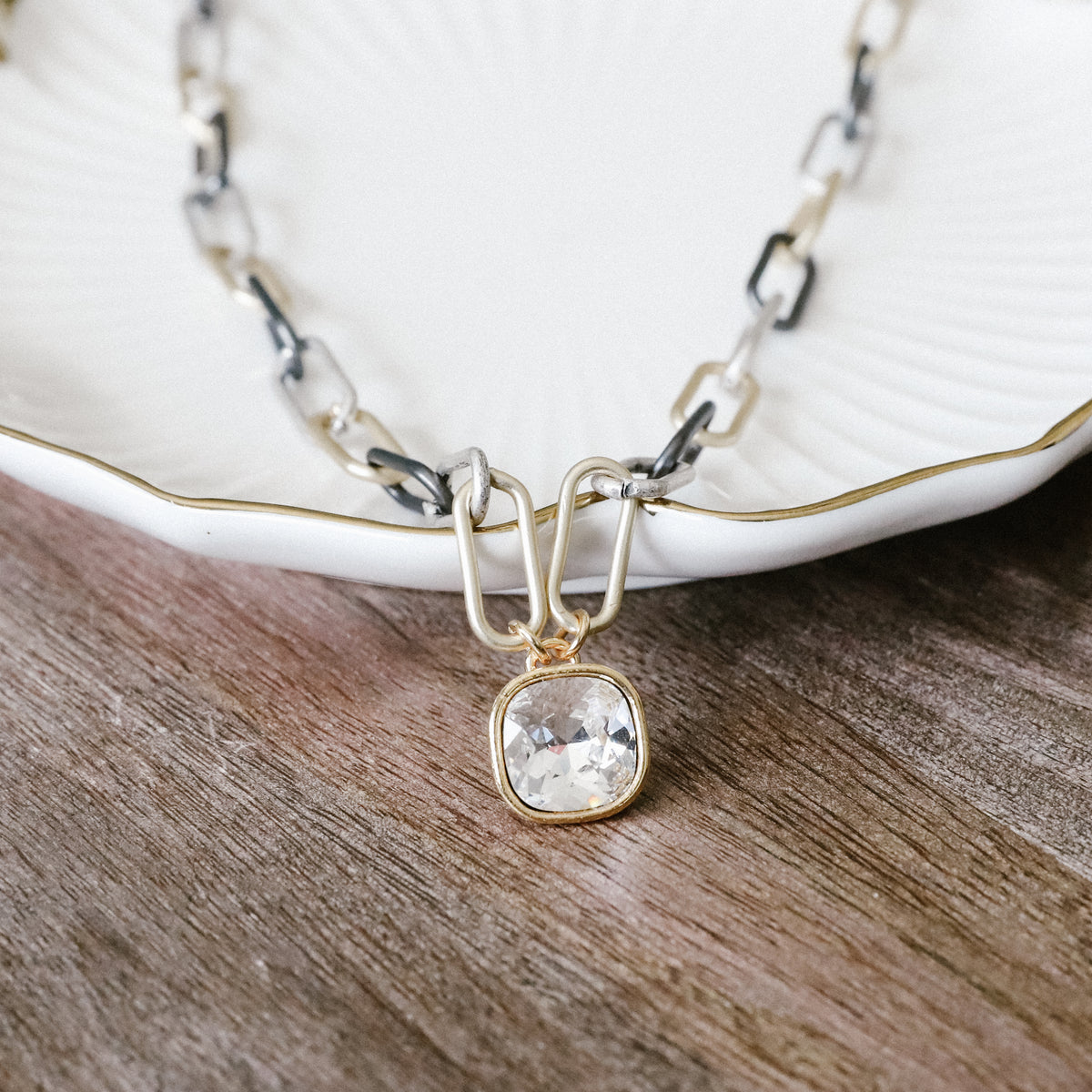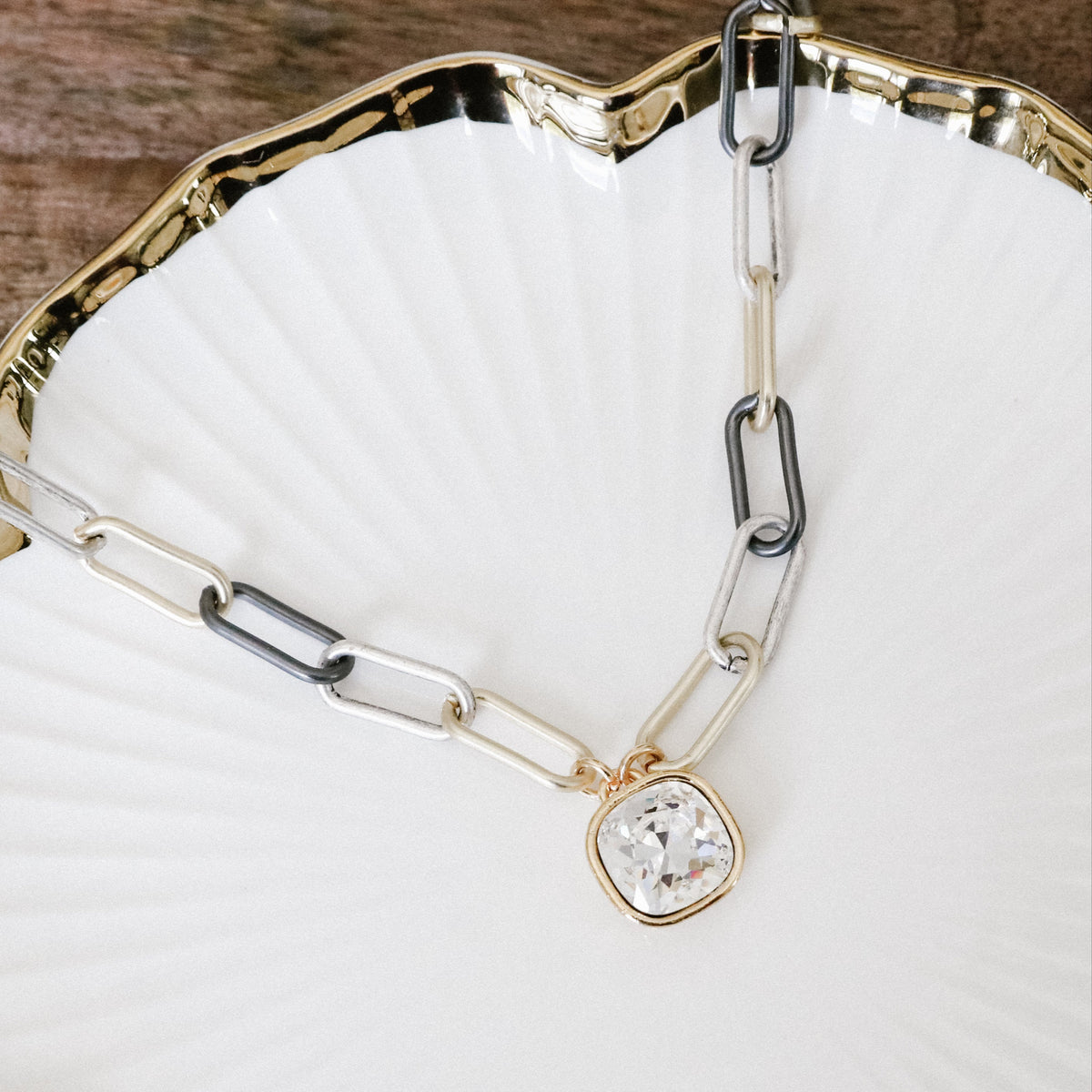 This playful necklace shines with a tri-metal paperclip chain and a sparkling cushion-cut crystal, making it your new go-to for daily sparkle.