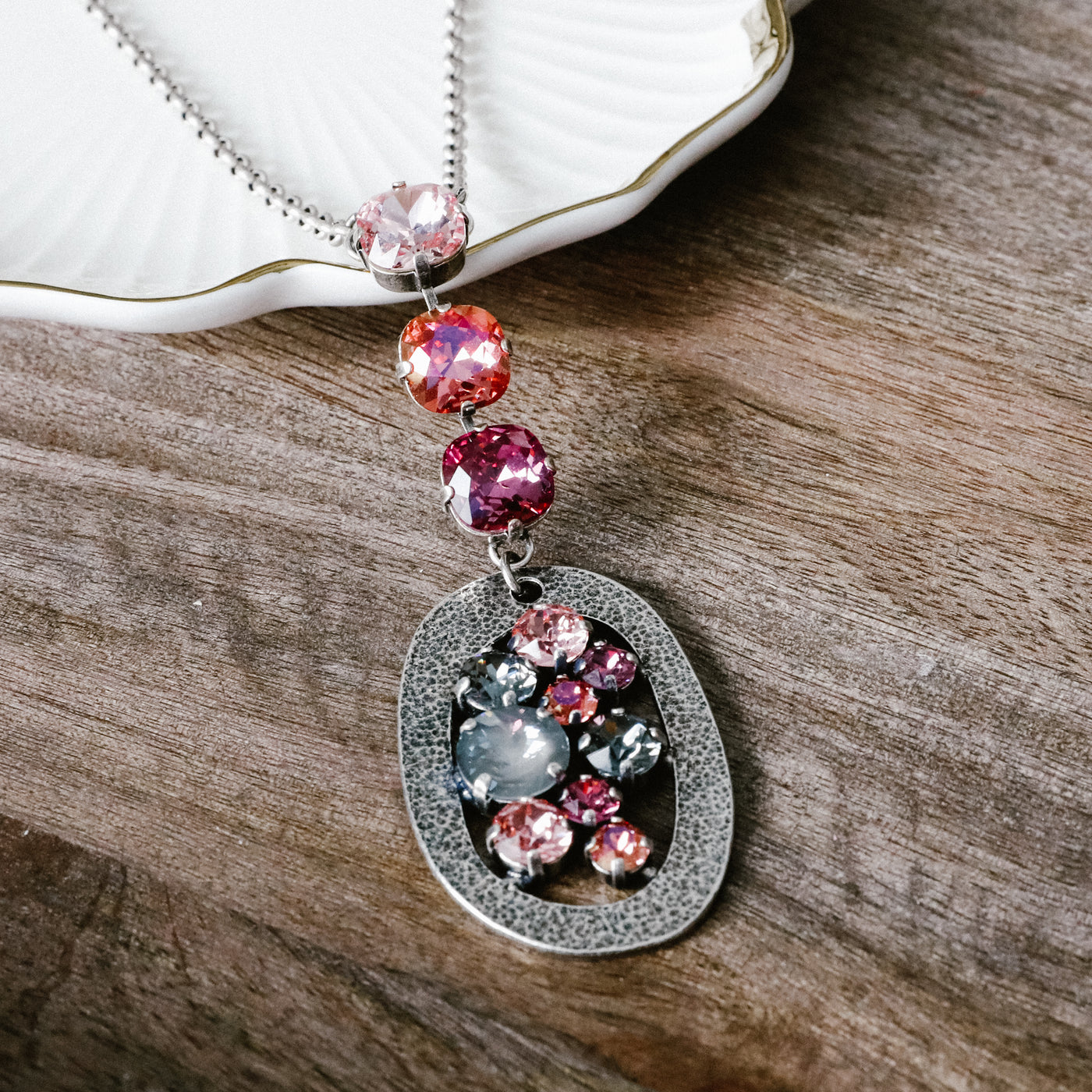 The Chrissy pendant necklace is the perfect mix of classic styling and artisan details. The length is 28" with an extender and our classic rolo chain. The pendant is a hammered metal with crystal stones in an a-symmetric pattern.