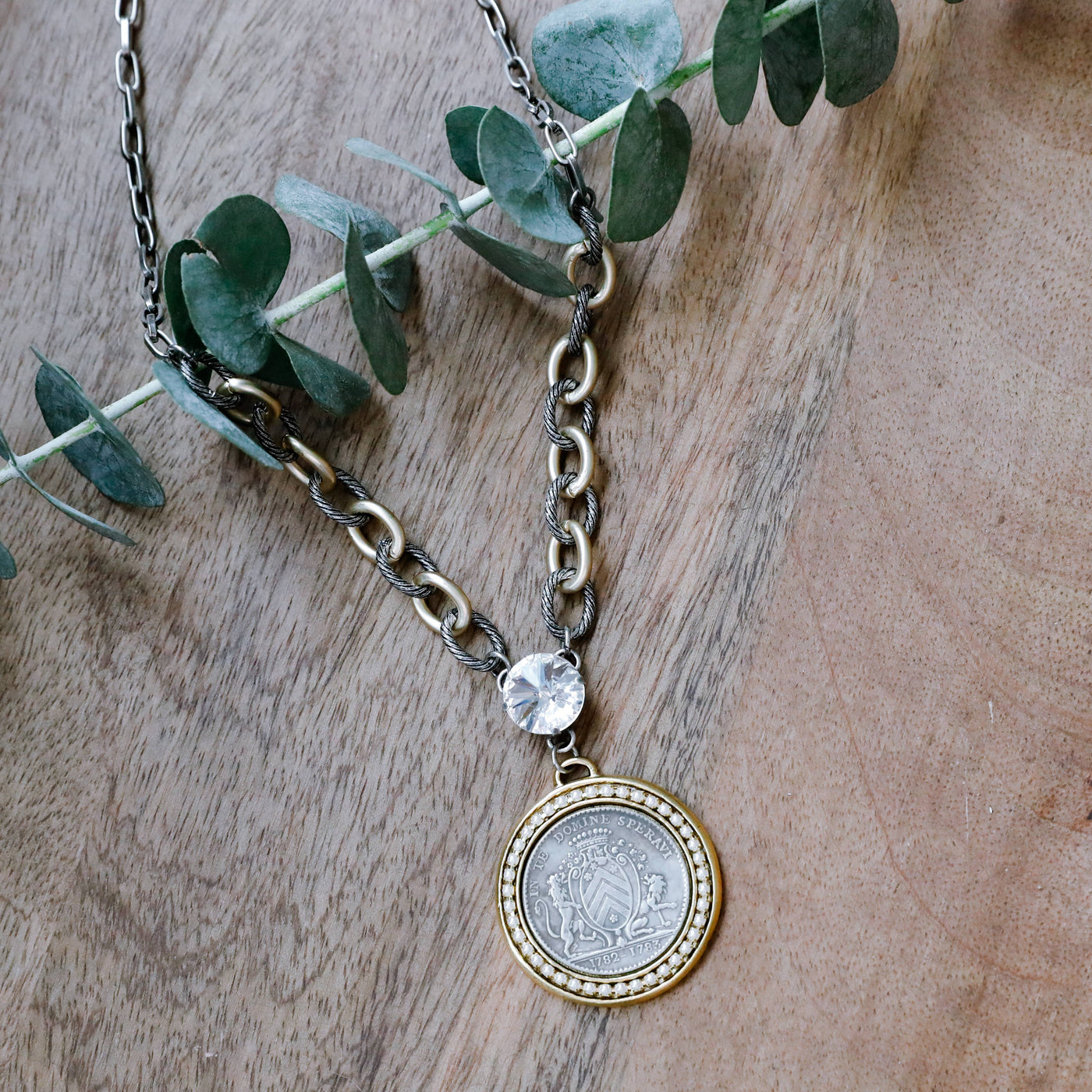 This necklace features a reproduction coin adorned with an elegant pearl halo and a mixed metal chain.