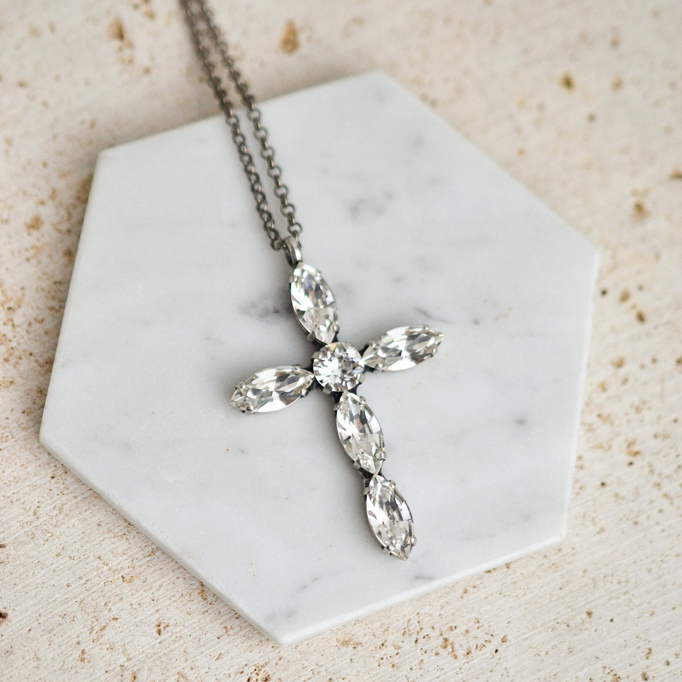 Felicity is a new cross necklace for RMD. She is about 2 1/2" long and 2" wide. The cross pendant hangs on a rolo chain necklace that is 16" long and has a short extender.