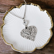 This long necklace features a filigree heart pendant, adding a charming touch to any outfit.
