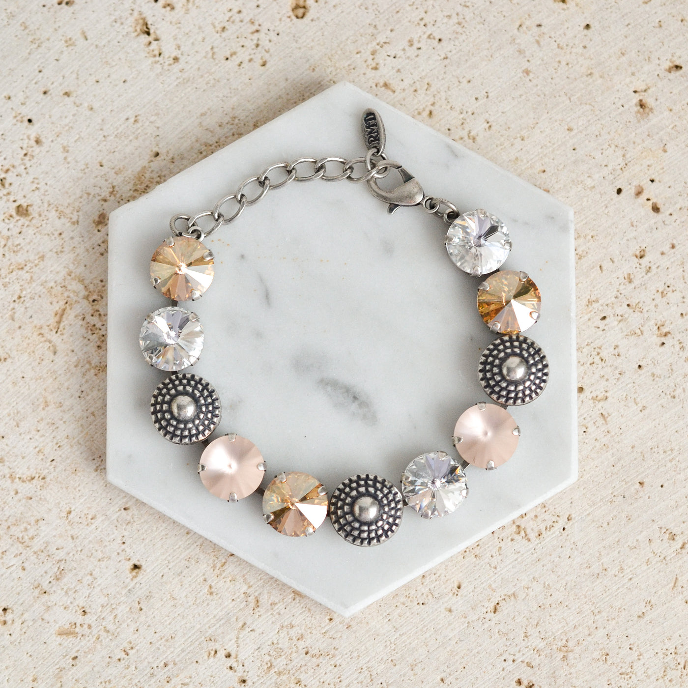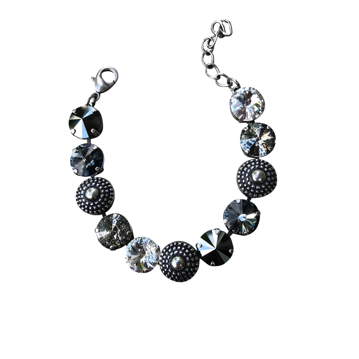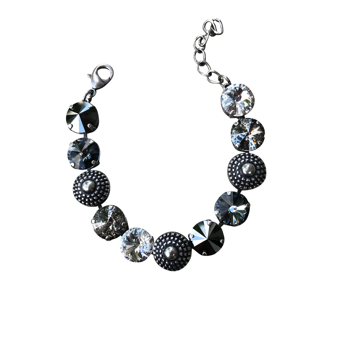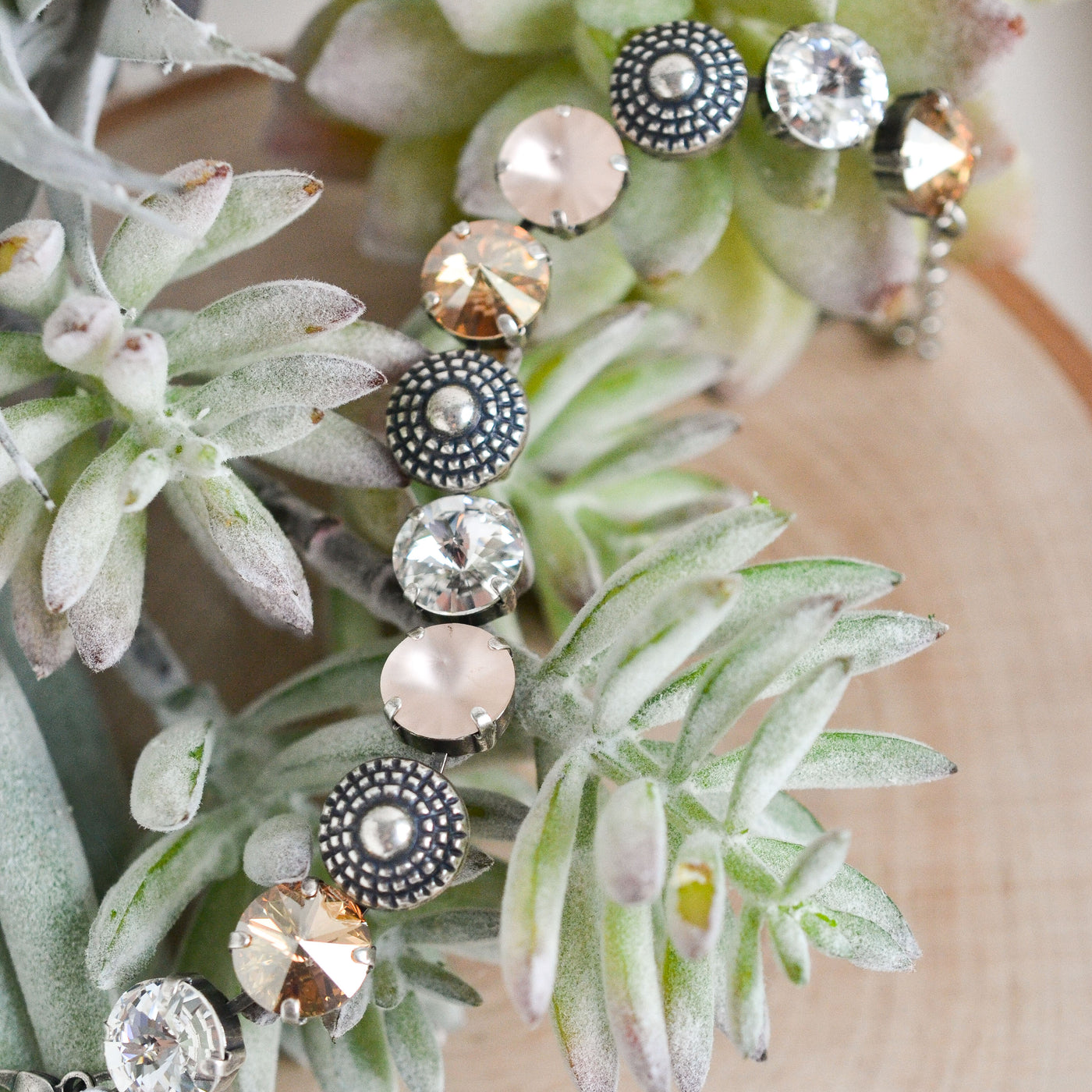 Hayden is for everyone that likes a little more texture in their jewelry. The Swarovski Rivoli stones are accented by antiqued silver button embellishments. Wear it solo or stack it up. Although, we are partial to stacking.