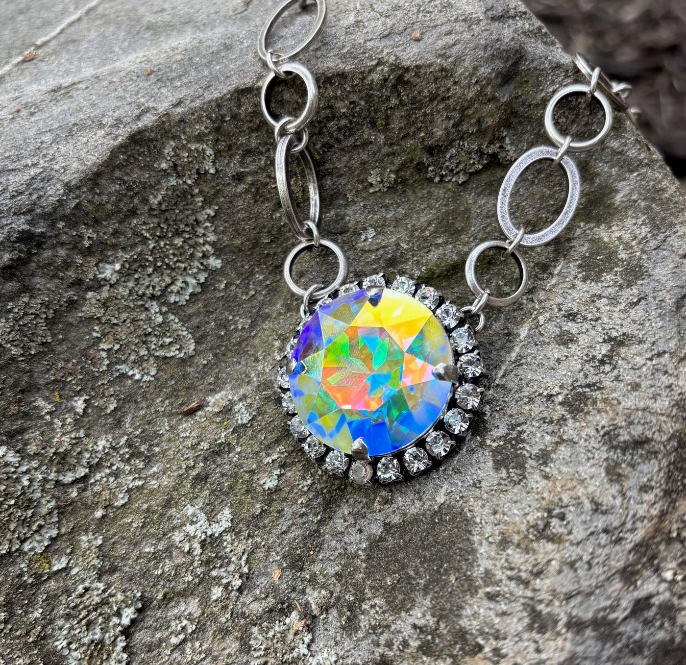 This necklace features a large crystal centerpiece adorned with a halo and a bold chain, creating an elegant and eye-catching design.