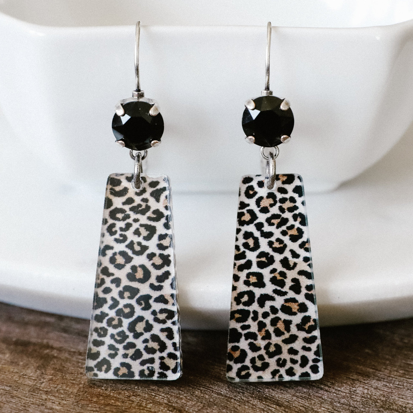 This pair of earrings features beautiful acrylic leopard print and Austrian Crystal Jet Colored stones set in an antique silver finish. Its leverback design offers both comfort and convenience, making it ideal for everyday wear.