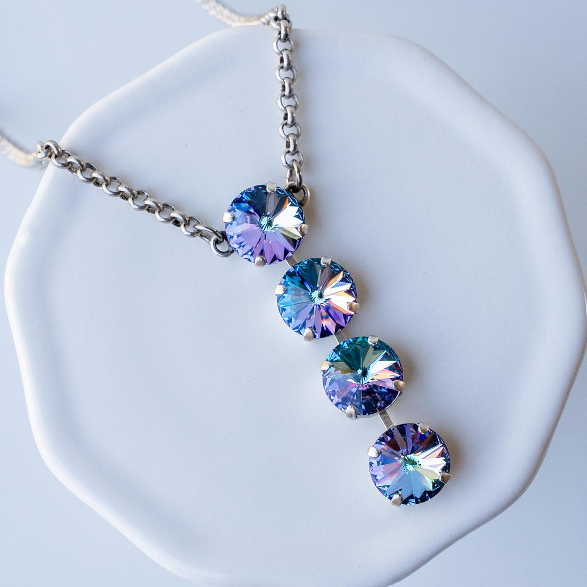 One of the original RMD collection pieces. Karen was named after a dear friend because the line originally was all numbered styles. This style is an 18" chain with 4 vertical stones. Wear with your favorite V-neck tee, scoop neck tank or with a button-down (top button undone).