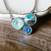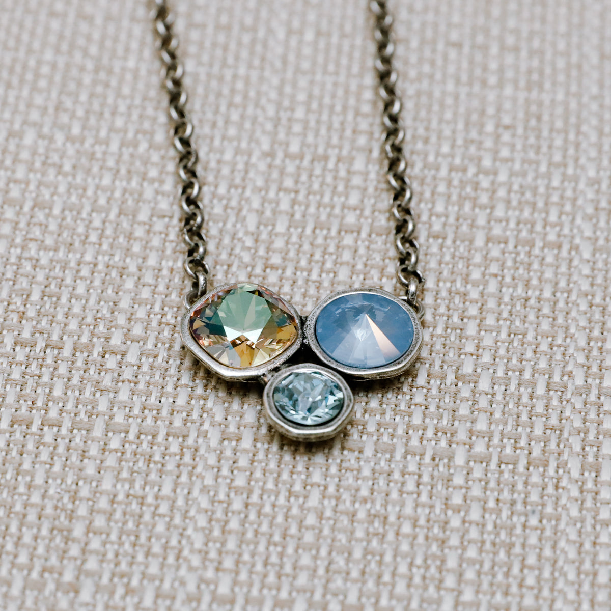 Missy is a mixed-size necklace with a cluster of unique stone shapes. Our favorite earrings for pairing with this necklace would be the Penny earring or the Jess earring. However, if you are a post girl, we would suggest the Jen earring or Janna earring.  Wear with your favorite V-neck tee, scoop neck tank or with a button-down (top button undone).