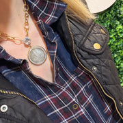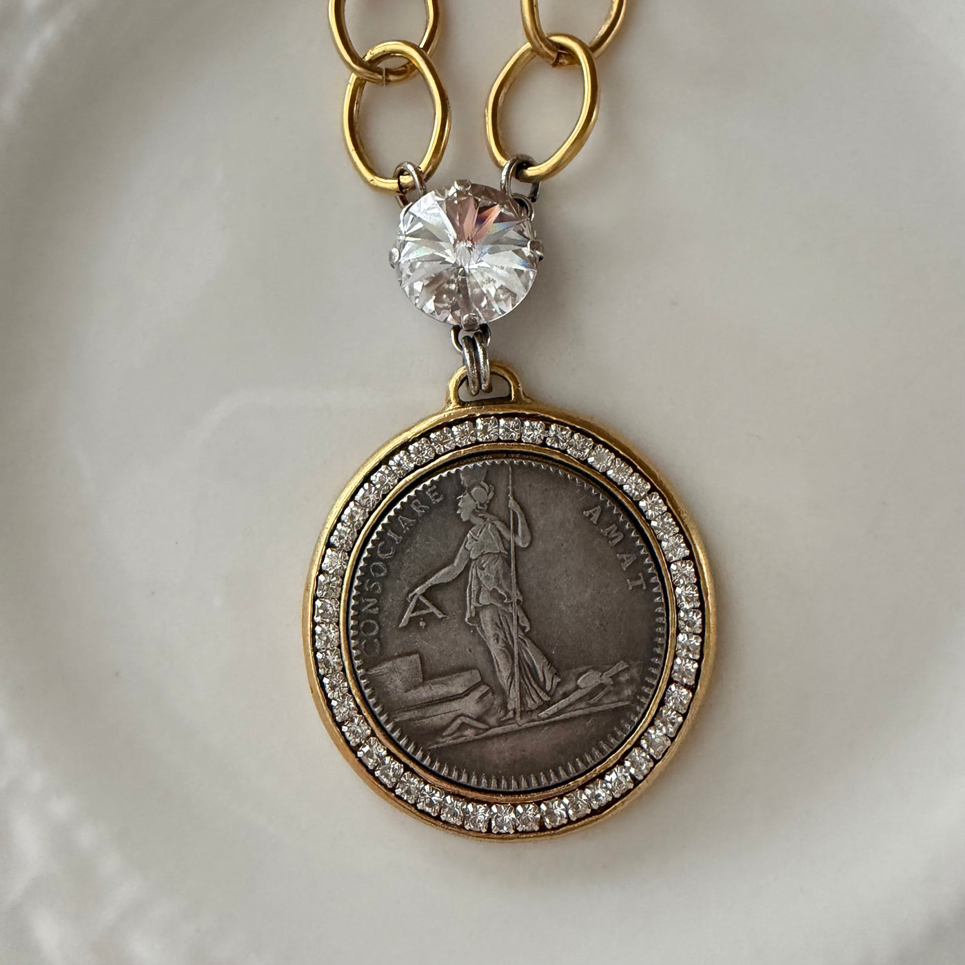 Bold gold chain meets sparkle! This mixed media necklace features a striking large clear crystal paired with an ornate coin...