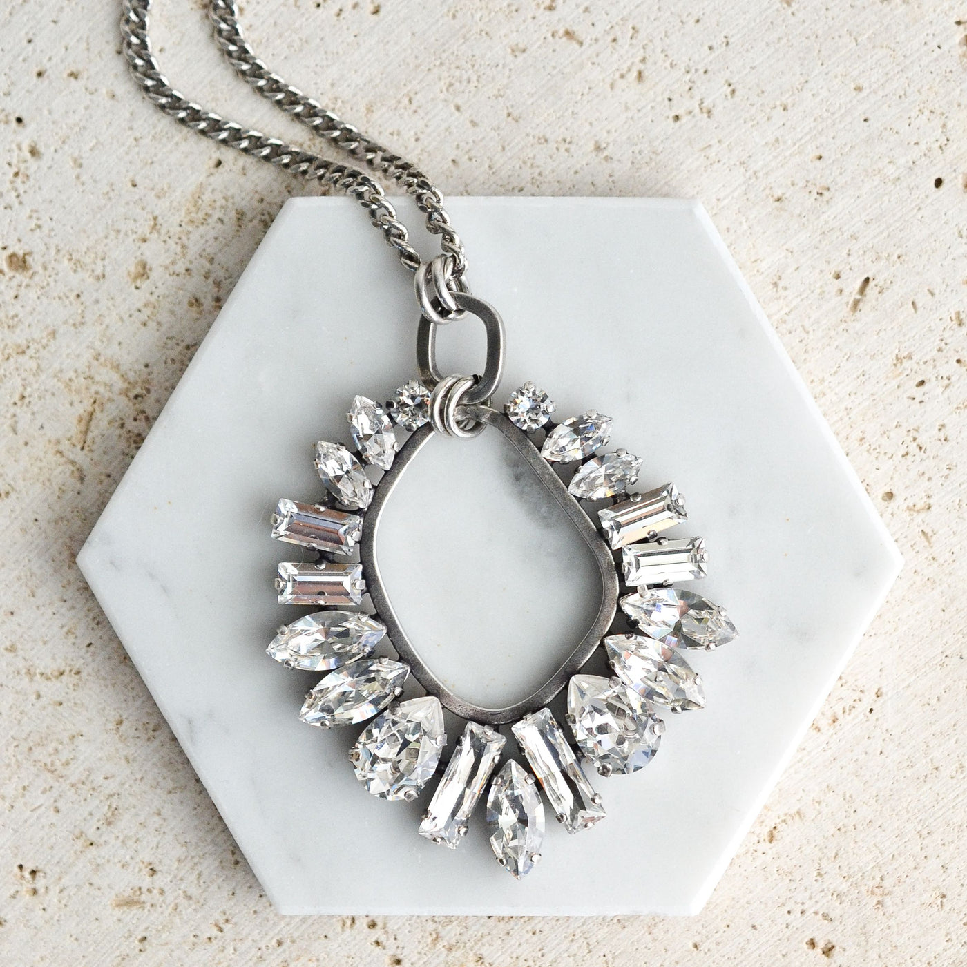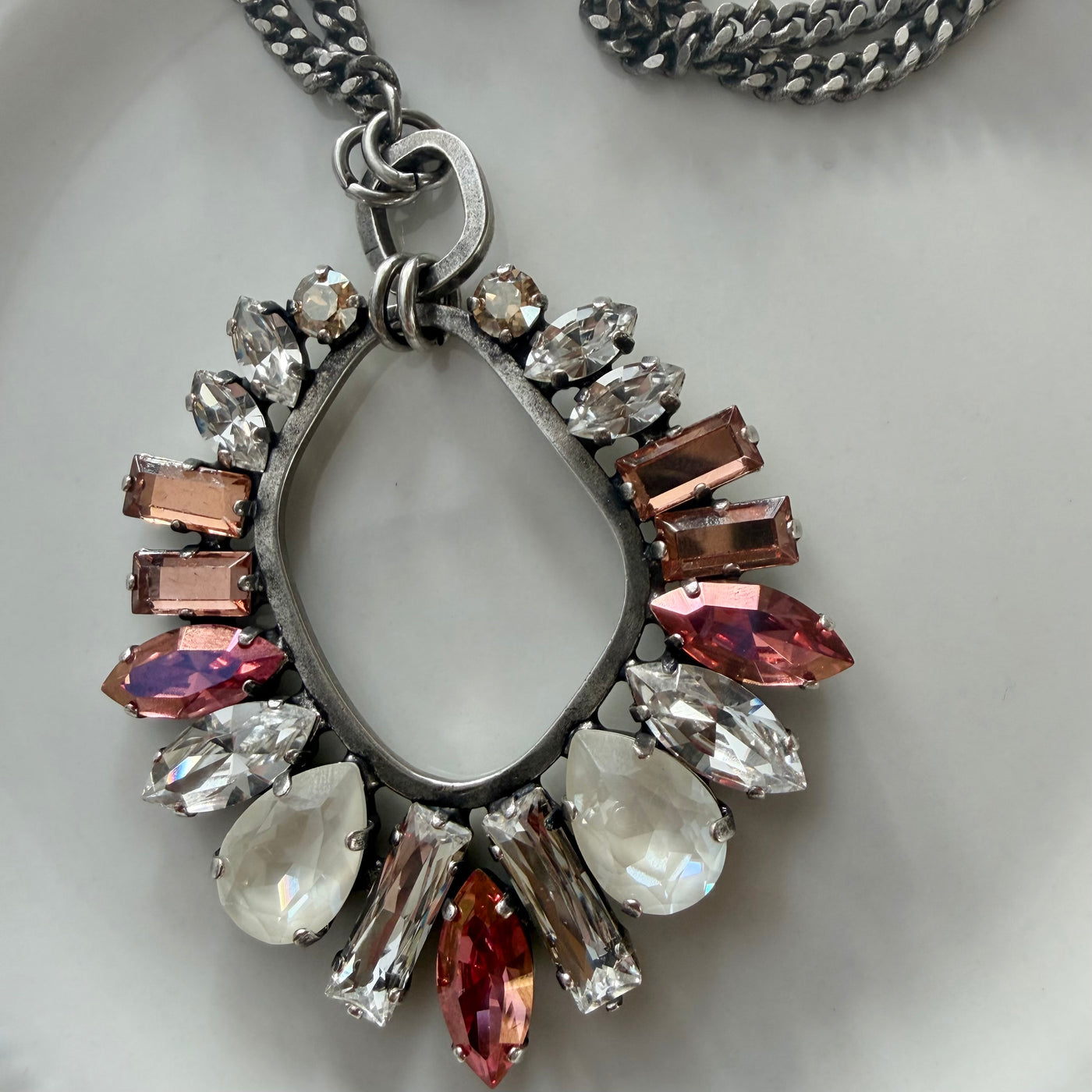 28" Long pendant style necklace with a-symmetric shape in various Swarovski Crystal sizes & cuts. Oxidized silver finish over brass...