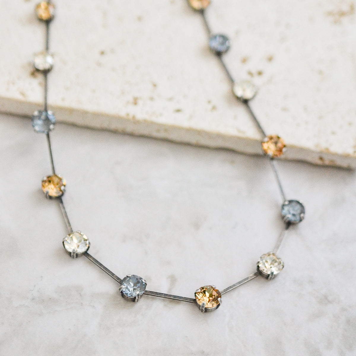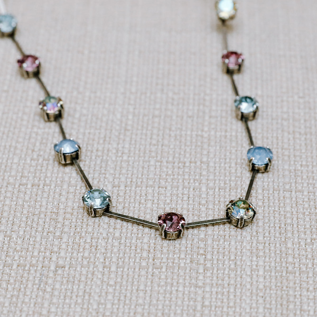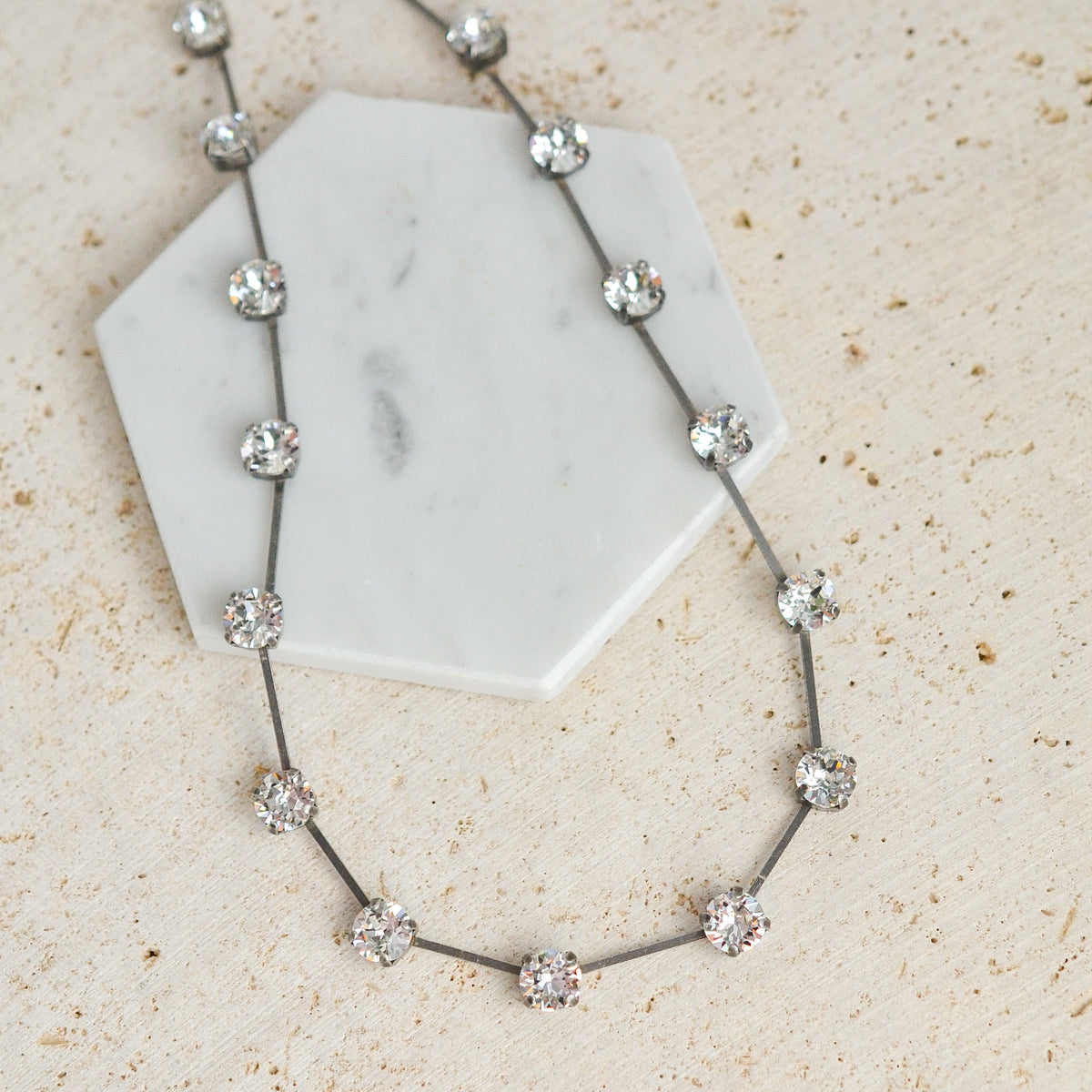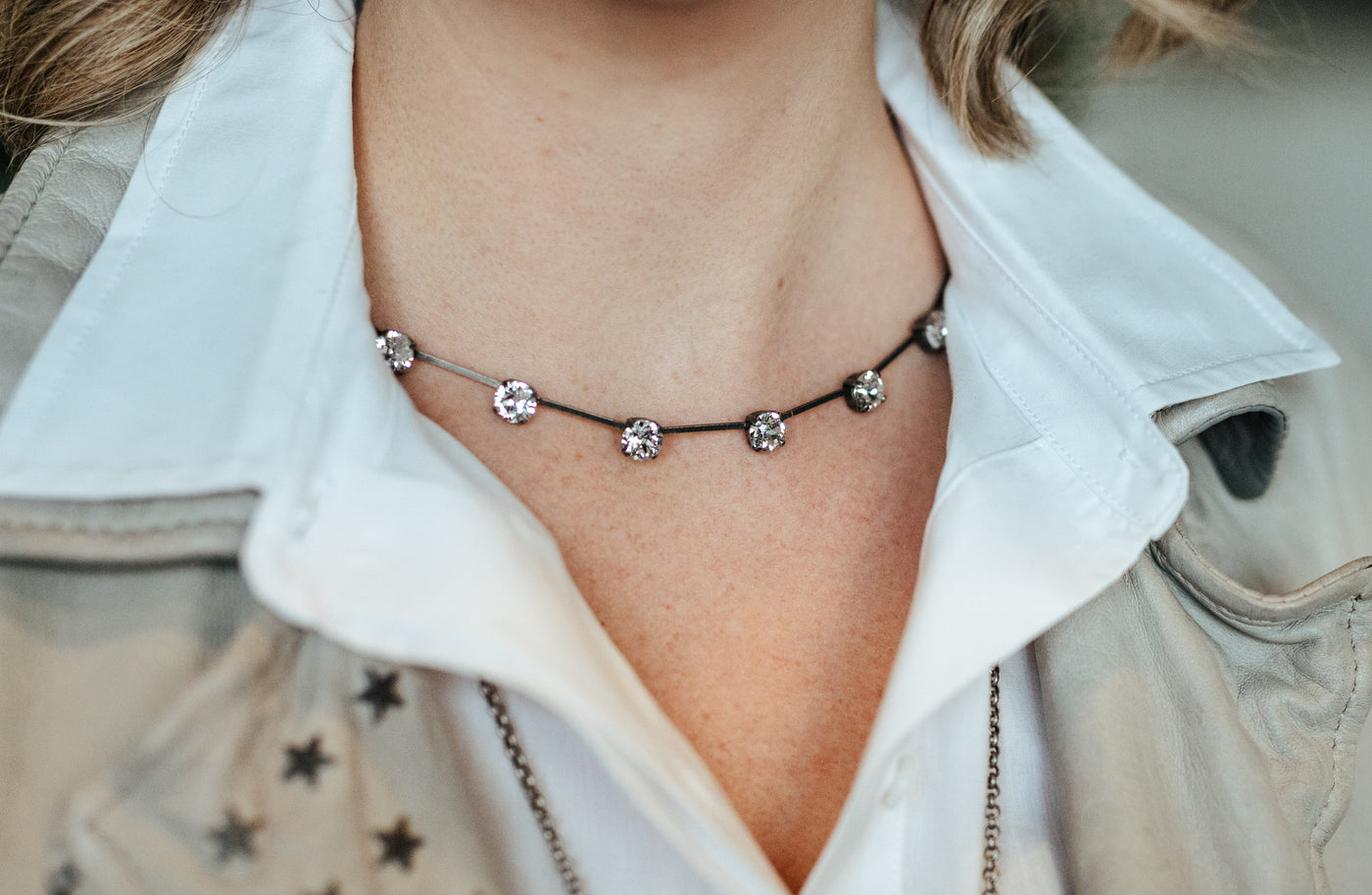 Tiffany has been in the RMD line for several years and is a consistent fan favorite. The stones surrounding this spaced out wreath-style necklace are 8mm crystal solitaires. Wear with your favorite V-neck tee, scoop neck tank or with a button-down (top button undone).