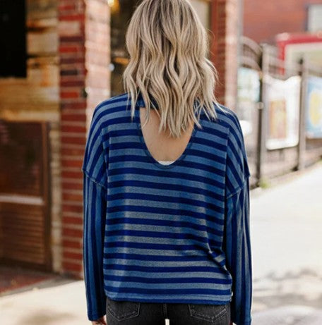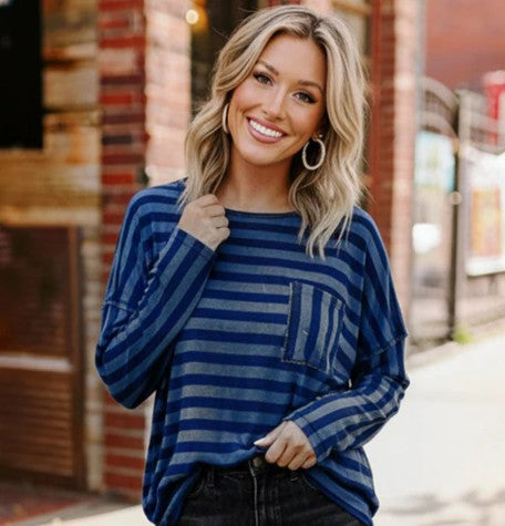 A LITTLE BIT OF FRAYED EDGE NEVER HURT ANYONE. THIS COZY STRETCH TOP WITH AN OPEN BACK IS ALL OF THE THINGS. NAVY AND GREY STRIPES WITH A POCKET—BECAUSE WHO DOESN'T LOVE A LITTLE EXTRA STORAGE? (Maybe for lipgloss-why not?) The tailored fit pairs perfectly with your favorite jeans or leggings, while the soft fabric keeps you comfortable all day long. Whether you're running errands or catching up with friends, this effortlessly cool striped tee delivers style without trying too hard. The open back detail adds just enough edge to make it feel special, and that handy front pocket? Pure genius for keeping your essentials close.
