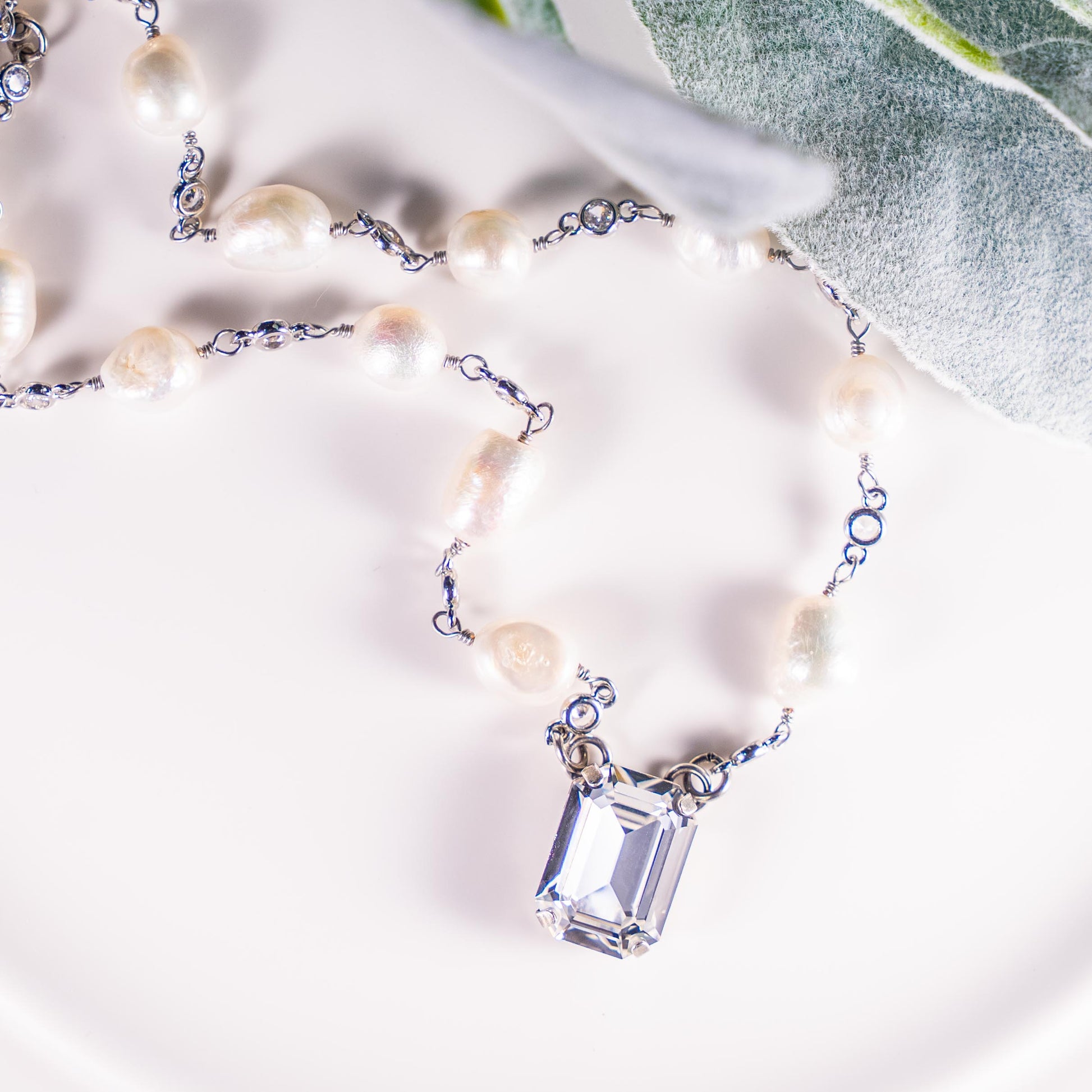 Expertly crafted with a beautiful octagon crystal and a delicately elegant pearl chain. Experience timeless sophistication with the Anniston Necklace.