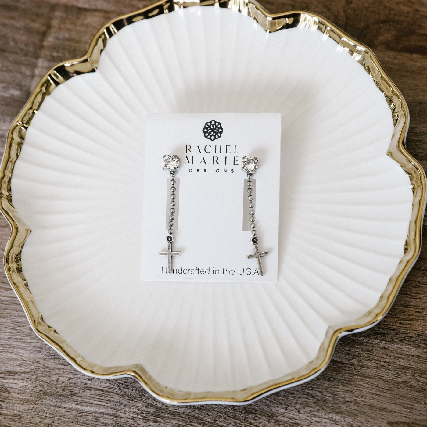 These Faith Earrings feature a post design with a delicate chain that ends in a tiny cross, adding a charming touch to your look.