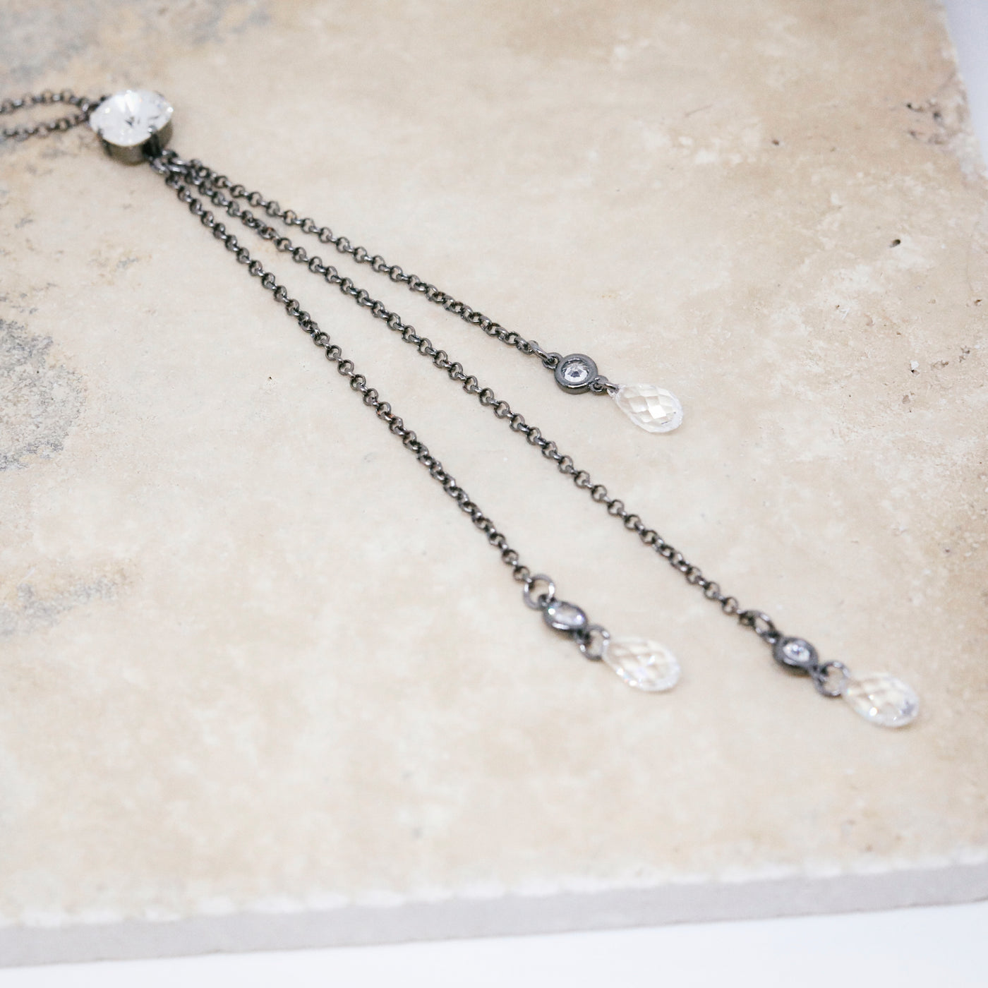 Jet Finish 12mm Cushion Cut Swarovski Crystal Elements 15/17" chain length with a 5" drop Lobster clasp closure Care for...